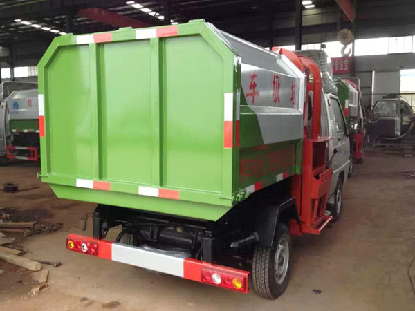 工作原理:自裝卸式垃圾車是由密封式垃圾廂、液壓系統、操作系統組成,能配幾十個垃圾桶,實現一車與多個垃圾桶聯合作業,廂體上的液壓升降裝置可將垃圾桶吊上、放下,上下升降,上下一次工作循環時間為50S,密封式廂體環保衛生,可避免二次污染。其自裝式的掛桶裝置可直接將路邊的垃圾桶掛在上面用提升機直接到在垃圾箱體里面省去了裝垃圾的麻煩。